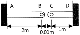 그림과 같이 단면적이 2 cm2인 AB및 CD막대의 B점과 C점이 1 cm만큼 떨어져 있다. 두 막대에 인장력을 가하여 늘인 후 B점과 C점에 핀을 끼워 두 막대를 연결하려고 한다. 연결 후 두 막대에 작용하는 인장력은 약 몇 kN인가? (단, 재료의 세로탄성계수는 200 GPa이다.)
