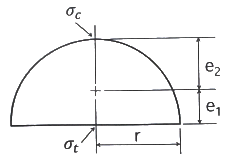그림과 같이 반지름 r인 반원형 단면을 갖는 단순보가 일정한 굽힘모멘트를 받고 있을 때, 최대인장응력(σt)과 최대압축응력(σc)의 비(σt/σc)는? (단, e1과 e2는 단면 도심까지의 거리이며, 최대인장응력은 단면의 하단에서, 최대압축응력은 단면의 상단에서 발생한다.)
