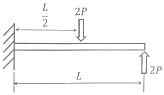 그림과 같이 외팔보에서 하중 2P가 두 군데 각각 작용할 때 이 보에 작용하는 최대굽힘모멘트의 크기는?