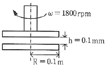 그림과 같이 평행한 두 원판 사이에 점성계수 μ=0.2Nㆍs/m2인 유체가 채워져 있다. 아래 판은 정지되어 있고, 윗 판은 1800rpm으로 회전할 때 작용하는 돌림힘은 약 몇 Nㆍm인가?