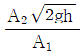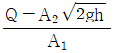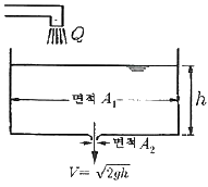 그림과 같이 물이 유량 Q로 저수조로 들어가고 속도 V=√2gh로 저수조 바닥에 있는 면적 A2의 구멍을 통하여 나간다. 저수조의 구면 높이가 변화하는 속도