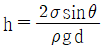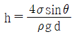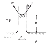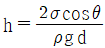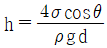 밀도가 ρ인 액체와 접촉하고 있는 기체 사이의 표면장력이 σ라고 할 때 그림과 같은 지름 d의 원통 모세관에서 액주의 높이 h를 구하는 식은? (단, g는 중력가속도이다.)