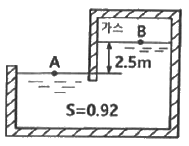 그림과 같은 탱크에서 A점에 표준 대기압이 작용하고 있을 때, B점의 절대압력은 약 몇 kPa 인가? (단, A점과 B점의 수직거리는 2.5m 이고 기름의 비중은 0.92 이다.)