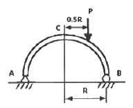 반원 부재에 그림과 같이 0.5R 지점에 하중 P가 작용할 때 지지점 B에서의 반력은?