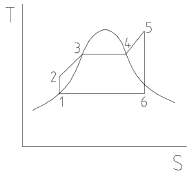 그림과 같이 온도(T)-엔트로피(S)로 표시된 이상적인 랭킨사이클에서 각 상태의 엔탈피(h)가 다음과 같다면, 이 사이클의 효율은 약 몇 %인다? (단, h1=30kJ/kg, h2=31kJ/kg, h3=274kJ/kg, h4=668kJ/kg, h5=764kJ/kg, h6=478kJ/kg)