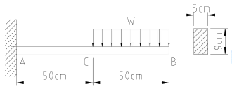 그림과 같은 외팔보가 있다. 보의 굽힘에 대한 허용응력을 80MPa로 하고, 자유단 B로부터 보의 중앙점 C사이에 등분보하중 w를 작용시킬 때, w의 허용 최대값은 몇 kN/m인가? (단, 외팔보의 폭 × 높이는 5cm × 9cm이다.)