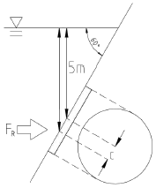 수평면과 60℃ 기울어진 벽에 지름이 4m인 원형창이 있다. 창의 중심으로부터 5m 높이에 물이 차있을 때 창에 작용하는 합력의 작용점과 원형창의 중심(도심)과의 거리(C)는 양 몇 m인가? (단, 원의 2차 면적 모멘트는 πR4/4이고, 여기서 R은 원의 반지름 이다.)