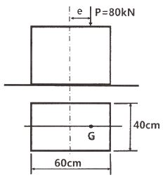 그림과 같은 단주에서 편심거리 e에 압축하중 P = 80kN이 작용할 때 단면에 인장응력이 생기지 않기 위한 e의 한계는 몇 cm 인가? (단, G는 편심 하중이 작용하는 단주 끝단의 평면상 위치를 의미한다.)