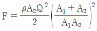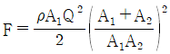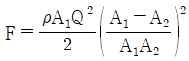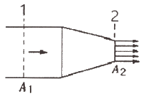 그림곽 같은 노즐을 통하여 유량 Q만큼의 유체가 대기로 분출될 때, 노즐에 미치는 유체의 힘 F는? (단, A1, A2는 노즐의 단면 1, 2에서의 단면적이고 ρ는 유체의 밀도이다.)