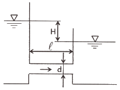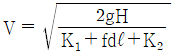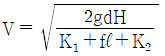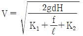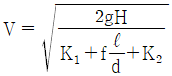 수면의 차이가 H인 두 저수지 사이에 지름 d, 길이 ℓ인 관로가 연결되어 있을 때 관로에서의 평균 유속(V)을 나타내는 식은? (단, f는 관마찰계수이고, g는 중력가속도이며, K1, K2는 관입구와 출구에서의 부차적 손실계수이다.)