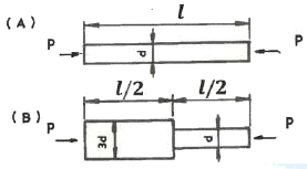 그림과 같이 A,B의 원형 단면봉은 길이가 같고, 지름이 다르며, 양단에서 같은 압축하중 P를 받고 있다. 응력은 각 단면에서 균일하게 분포된다고 할 때 저장되는 탄성변형 에너지의 비 UB/UA 는 얼마가 되겠는가?