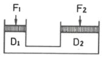 그림과 같은 유압 잭에서 지름이 D2=2D1 일 때 누르는 힘 F1과 F2의 관계를 나타낸 식으로 옳은 것은?