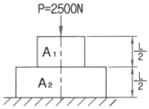 그림과 같이 길이가 동일한 2개의 기둥상단에 중심 압축 하중 2500N이 작용할 경우 전체 수축량은 약 몇 mm인가? (단, 단면적 A1=1000mm2, A2=2000mm2, 길이 L=300mm, 재료의 탄성계수 E=90GPa이다.)