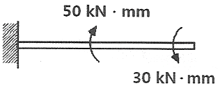 그림과 같이 한 끝이 고정된 지름 15mm인 원형단면 축에 두 개의 토크가 작용하고 있다. 고정단에서 축에 작용하는 전단응력은 약 몇 MPa 인가?