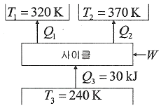 다음 냉동 사이클에서 열역학 제1법칙과 제2법칙을 모두 만족하는 Q1, Q2, W는?