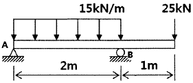 그림과 같은 보가 분포하중과 집중하중을 받고 있다. 지점 B에서의 반력의 크기를 구하면 몇 kN인가?