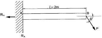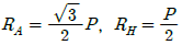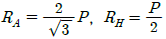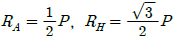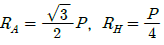 다음 자유 물체도에서 경사하중 P가 작용할 경우 수직반력(RA) 및 수평반력(RH)은 각각 얼마인가? (단, 그림에서 보 AB와 P가 이루는 각도는 30°이다.) (문제 오류로 가답안 발표시 4번으로 발표되었지만 확정답안 발표시 모두 정답처리 되었습니다. 여기서는 1번을 누르면 정답 처리 됩니다.)
