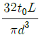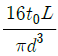 직경이 d이고 길이가 L인 균일한 단면을 가진 직선축이 전체 길이에 걸쳐 토크 t0가 작용할 때, 최대 전단응력은?