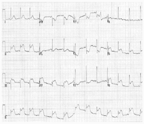 2시간 전부터 시작된 심한 흉통을 호소하는 환자의 심전도가 다음과 같을 때, TIMI score 상 이 환자의 사망 가능성을 높이는 것으로 옳은 것은?