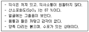 50대 남자가 배터리 공장에서 발생한 화재로 화상을 입었다는 신고를 받고 출동하였다. 환자평가 결과가 다음과 같을 때, 구급대원이 시행해야 할 응급처치로 옳지 않은 것은?