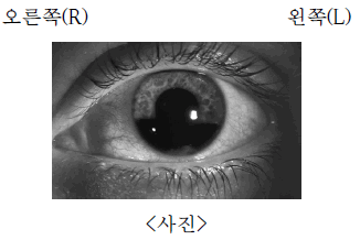21세 남자가 폭력현장에서 얼굴 부위를 맞았다는 119 신고로 출동한 구급대원이 환자의 상태를 확인한 결과, 두 눈 중 손상을 입은 눈의 사진이 다음과 같을 때, 시행해야 할 처치로 가장 옳은 것은?