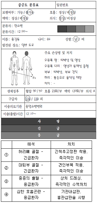 일반 도로에서 발생한 3중 추돌 사고 현장의 다수사상자 중증도 분류표이다. 이에 대한 해석과 처치가 모두 옳은 것은?