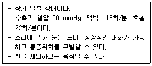 40대 남자가 가정집에서 칼에 배를 찔렸다는 신고를 받고 출동하였다. 다음 환자에게 구급대원이 해야 할 응급처치로 옳은 것은?