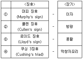 복부 또는 복부 주변 장기의 통증을 호소하는 환자의 감별에는 특징적인 징후가 도움이 된다. 징후와 장기의 연결이 바른 것은?