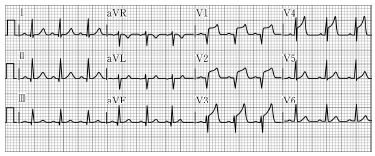 55세 남자가 회의 도중 가슴을 짓누르는 듯한 통증과 답답함을 호소한다. 현장에 도착한 구급대원이 시행한 심전도가 다음과 같을 때 의심할 수 있는 소견으로 옳은 것은?