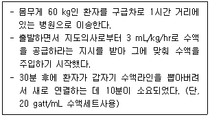다음 환자에게, 남은 20분 안에 지시받은 수액을 모두 주입하기 위해 새로 설정해야할 수액 주입속도로 옳은 것은?