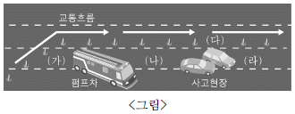 교통사고 현장에 펌프차와 구급차가 출동하였다. <그림>과 같이 펌프차가 먼저 도착해서 현장 안전을 확보하였을 때 뒤에 도착한 구급차의 정차 위치로 옳은 것은? (단, 화재, 유독 가스, 화학 물질 등의 사고는 없는 현장이다.)