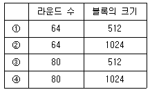 SHA-512 알고리즘의 수행 라운드 수와 처리하는 블록의 크기(비트 수)를 바르게 짝 지은 것은?
