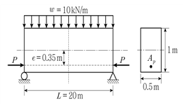 그림과 같은 긴장재를 편심 배치한 프리스트레스트 콘크리트 보에 자중을 포함한 등분포하중 w가 작용한다. 내력개념에 기초하여 해석할 때, 경간 중앙 위치에서 보 단면의 도심과 단면 내 압축력 C의 작용점 사이의 거리 e′[mm] 및 하단 수직응력 fbot[MPa]는? (단, 프리스트레스 힘 P=1,000kN이고, 콘크리트 보의 단면적은 긴장재를 무시한 총단면적을 사용한다)(순서대로 e′, fbot)