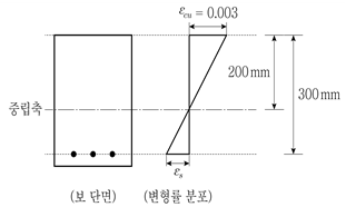 그림과 같은 단철근 철근콘크리트 직사각형 보에서 인장철근의 응력 fs[MPa]는? (단, 콘크리트의 설계기준압축강도 fck=21MPa, 철근의 설계기준항복강도 fy=400MPa, 철근의 탄성계수 Es=200,000MPa, εcu는 콘크리트 압축연단의 극한변형률, εs는 인장철근의 변형률이며, KDS 14 20 20을 따른다)