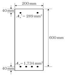 그림과 같은 복철근 철근콘크리트 직사각형 보가 극한상태에서 인장철근과 압축철근이 모두 항복할 때, 압축연단에서 중립축까지 거리 c[mm]는? (단, 철근의 설계기준항복강도 fy=400MPa, 콘크리트의 설계기준압축강도 fck=20MPa, As는 인장철근 단면적, As′은 압축철근 단면적이며, KDS 14 20 20을 따른다)