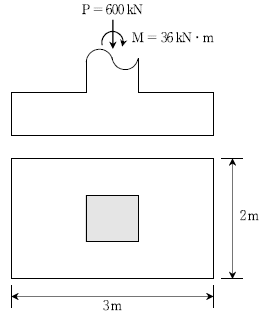 그림과 같이 바닥판과 기둥의 중심에 수직하중 P=600 kN과 휨모멘트 M=36 kNㆍm가 작용할 때, 확대기초에 발생하는 최대 응력[kN/m2]은?