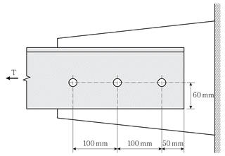 그림과 같은 인장재 ㄱ형강의 블록전단강도 산정 시, 전단파단에 대한 전단저항 순단면적 Anv[mm2]는? (단, 볼트구멍의 직경 dh는 24mm이고, 부재의 두께 t는 10mm이다)