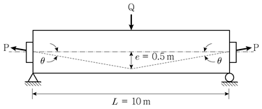 그림과 같이 지간 중앙에 집중하중 Q=50kN이 작용하는 프리스트레스트콘크리트 단순보의 지간 중앙에서 휨모멘트의 크기[kNㆍm]는? (단, 프리스트레스 힘 P는 100kN이고, sinθ≃tanθ 이며, 보의 자중과 프리스트레스 손실은 무시한다)