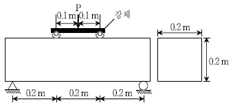 그림과 같이 장방형 무근 콘크리트보에서 3등분점 하중법(KS F2408)에 의해서 보가 파괴될 때까지 시험을 실시하였다. 하중 P가 100 kN에서 시편의 지간 중앙이 파괴되었을 때의 최대인장응력 [MPa]은? (단, 거동이 탄성적이고 휨응력이 단면의 중립축에서 직선으로 분포한다고 가정한다)
