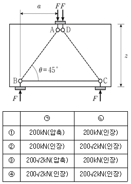 그림과 같은 깊은 보의 스트럿-타이모델에서 F가 200kN인 경우, 경사 스트럿 AB의 부재력(㉠)과 수평 타이 BC의 부재력(㉡)을 바르게 연결한 것은? (단, 자중은 무시한다)