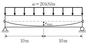 그림과 같이 곡선 배치 된 PSC 단순보에 프리스트레스 힘 P=2,500kN이 작용할 때, 부재에 작용하는 하중 w와 평형을 이루는 지간 중앙에서의 최대편심(emax) 거리[m]는? (단, 자중과 프리스트레스 손실은 무시한다)