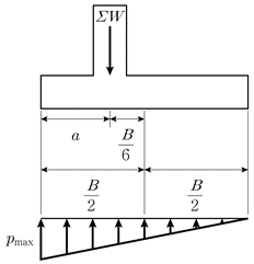 합력의 연직성분 ∑W=300kN이 편심거리가 B/6인 위치에 작용할 때 B=3m인 기초 저판에 발생되는 지지력분포는 그림과 같다. 최대 지반 지지력(pmax)의 크기[kN/m2]는? (단, 단위폭으로 고려하고, 지반조건은 균일하며, 자중은 무시한다)