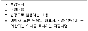 관광진흥법령상 여행업자가 여행계약서에 명시된 여행일정을 변경하는 경우 여행자로부터 받아야 하는 서면동의서에 포함되어야 하는 것을 모두 고른 것은?