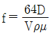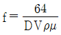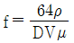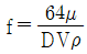 원관 속의 흐름에서 관의 직경, 유체의 속도, 유체의 밀도, 유체의 점성계수가 각각 D, V, ρ, μ로 표시될 때 층류 흐름의 마찰계수(f)는 어떻게 표현될 수 있는가?