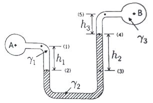 그림과 같은 U자관 차압액주계에서 γ1 = 9.8kN/m3, γ2 = 133kN/m3, γ3 = 9.0kN/m3, h1 = 0.2m, h3 = 0.1이고 압력차 pA - pB = 30kPA이다. h2는 몇 m 인가?