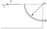 그림에서 물에 의하여 점 B에서 힌자된 사분원 모양의 수문이 평형을 유지하기 위하여 수면에서 수문을 잡아 당겨야 하는 힘 T는 약 몇 [kN]인가? (단, 수문의 폭 1[m], 반지름 (