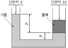 단면적이 A와 2A인 U자형 관에 밀도가 d인 기름이 담겨져 있다. 단면적이 2A인 관에 관벽과는 마찰이 없는 물체를 놓았더니 그림과 같이 평형을 이루었다. 이 때 이 물체의 질량은?