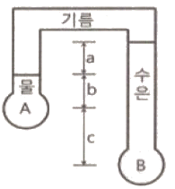 그림과 같은 거꾸로 된 마노미터에서 물과 기름, 수은이 채워져 있다. a=10cm, c=25cm이고 A의 압력이 B의 압력보다 80kPa작을 때 b의 길이는 약 몇 cm인가? (단, 수은의 비중량은 133100N/m3, 기름의 비중은 0.9이다.)