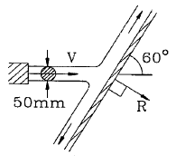 그림과 같이 60°로 기울어진 고정된 평판에 직경 50mm의 물 분류가 속도(V) 20m/s로 충돌하고 있다. 분류가 충돌할 때 판에 수직으로 작용하는 충격력 R(N)은?
