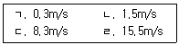 지름이 5cm인 원형 관내에 이상기체가 층류로 흐른다. 다음 중 이 기체의 속도가 될 수 있는 것을 모두 고르면? (단, 이 기체의 절대압력은 200kPa, 온도는 27℃, 기체상수는 2080 J/kg·K, 점성계수는 2×10-5 N·s/m2, 하임계 레이놀즈수는 2200으로 한다.)